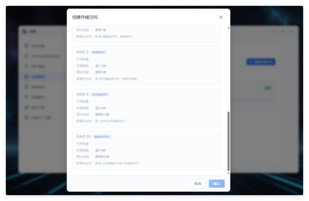 RAID 的格式支持还是比较全的,从 Linear 到 RAID 10 都有。既然是双盘,那我们就组一个 RAID 1吧。