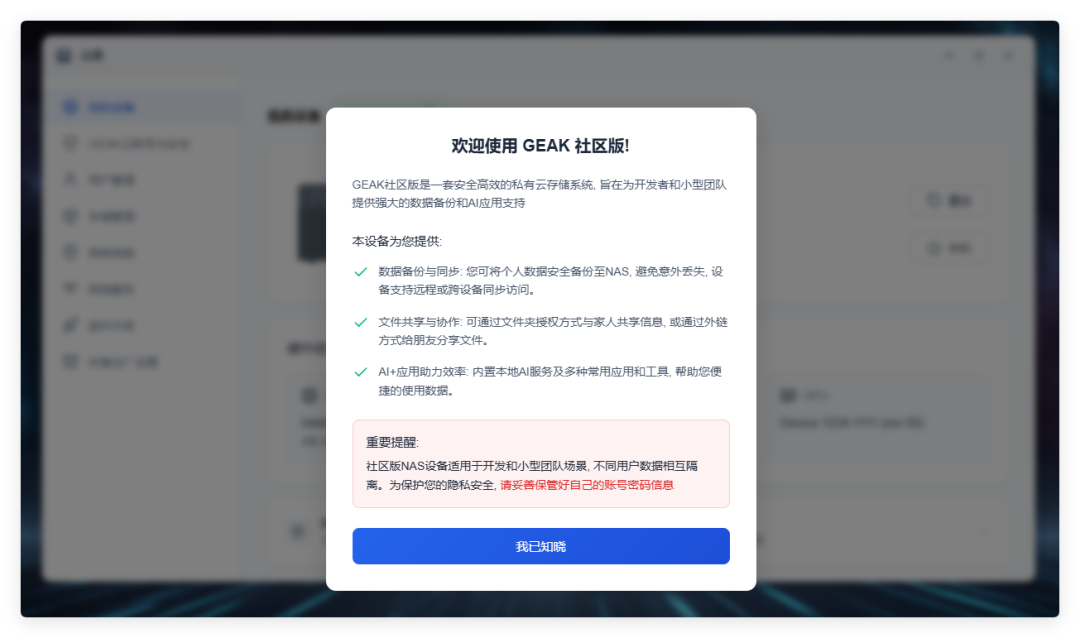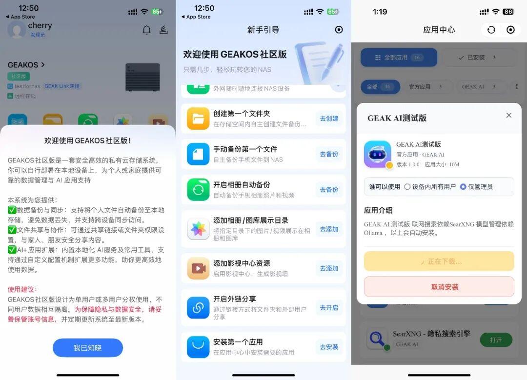 初次登陆系统,还是有一个很不错的引导。而且手机端也可以查看应用中心进行下载。看了一下 GEAK AI (下载了很久没成功),它是通过 SearXNG 搜索 + Ollama 来做的,感觉挺有意思。