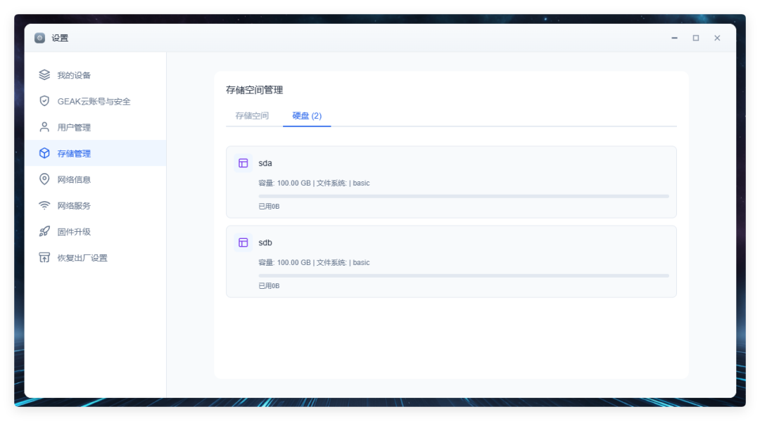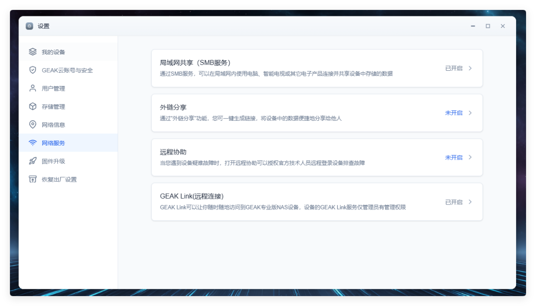 NAS 本身只提供了 SMB 服务,所以文件功能上还是比较单薄的。分享方面支持 GEAK Link 分享。