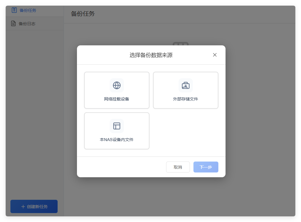文件备份是一个单独的页面,备份数据源包括网络挂载设备、外部存储设备、本 NAS 设备三个渠道,备份目的地都是 NAS。