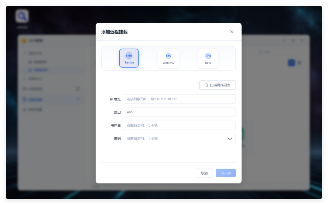 文件管理系统里,支持挂载 SMB/WebDAV/NFS 等远程文件。