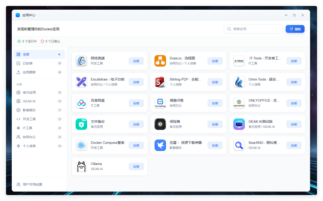点开应用中心,内置了 16 个应用。其中 3 个官方应用,包括文件备份、保险箱、GEAK AI,剩下的基本上都是 docker 应用。