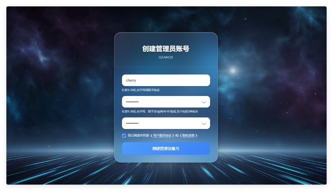 初次登录需要设置管理员账号密码。从这个登录页面来看,背景还是比较 GEAK 的。