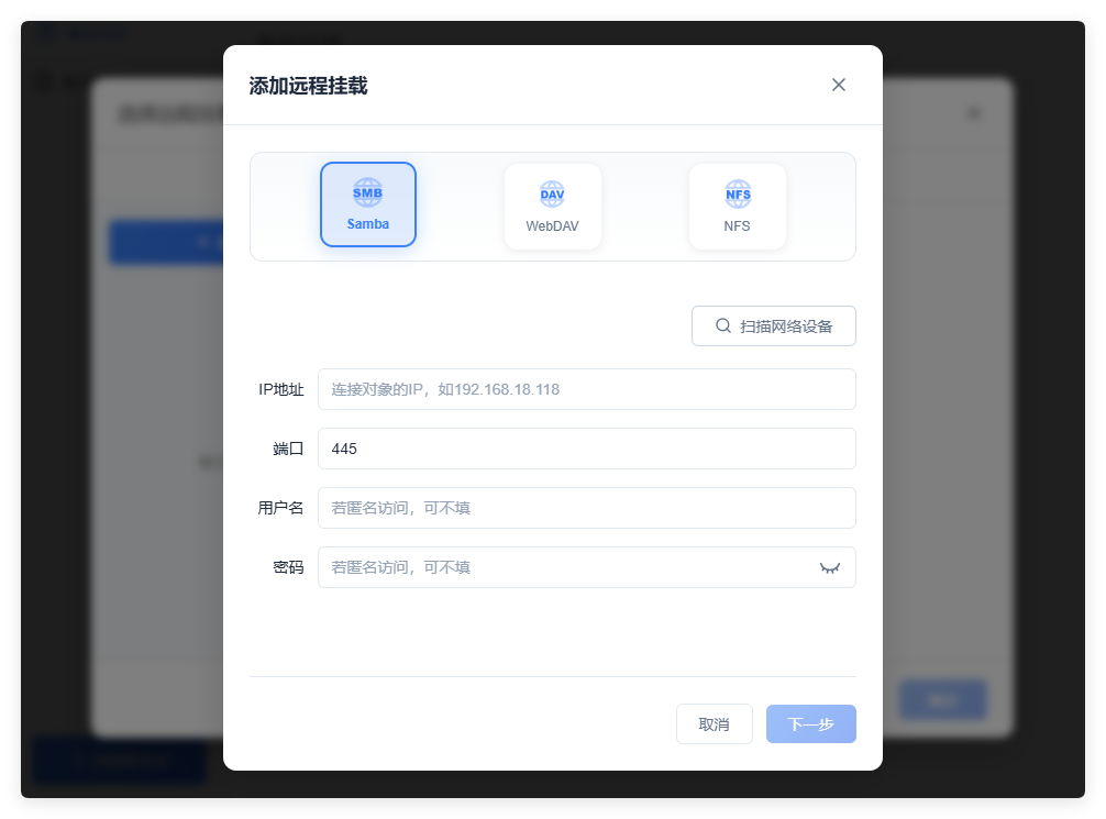 远程挂载的话,目前支持 SMB/WebDav/NFS 三种。